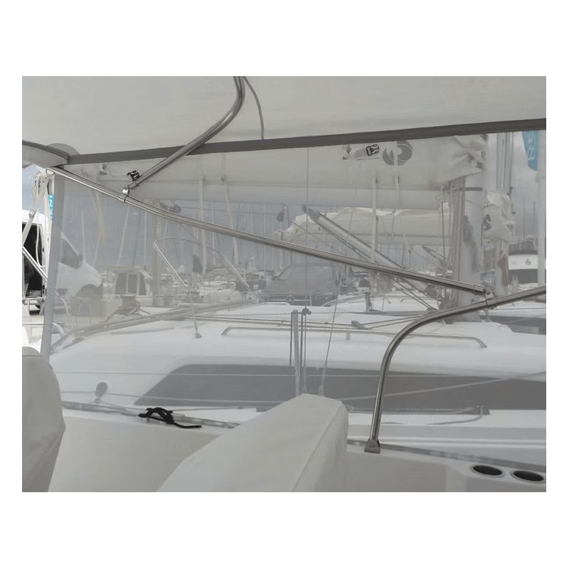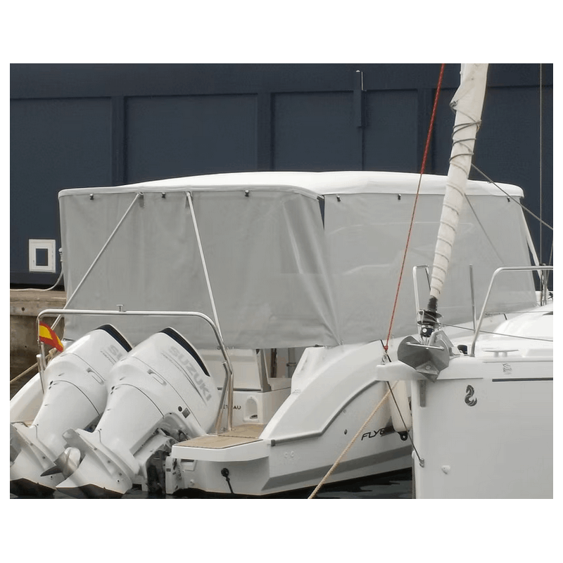 - Les tauds latéraux offrent une ombre agréable le matin et l’après-midi lorsque le soleil est bas. Réalisés en tissu ajouré Batyline® de Serge Ferrari, à la fois élégant et durable, ils apportent confort et intimité au mouillage comme au port.